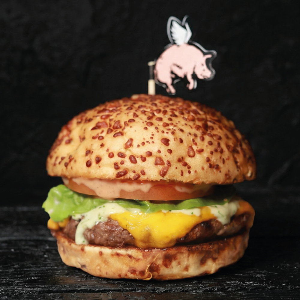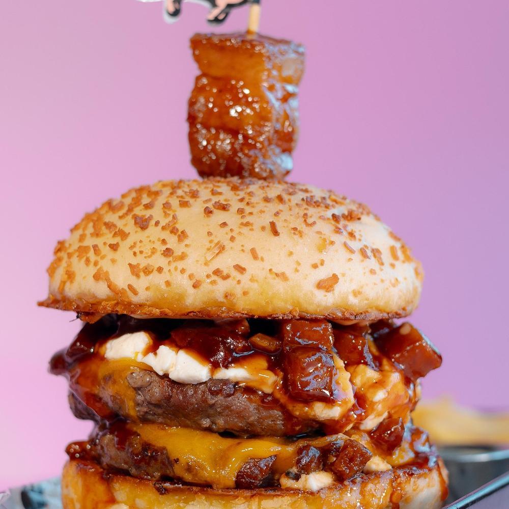 Pan artesanal de queso parmesano, carne de 166g. de res y cerdo, chicharrón crujiente bañado en salsa de la casa, queso cheddar, queso crema philadelphia, cubo de chicharrón
