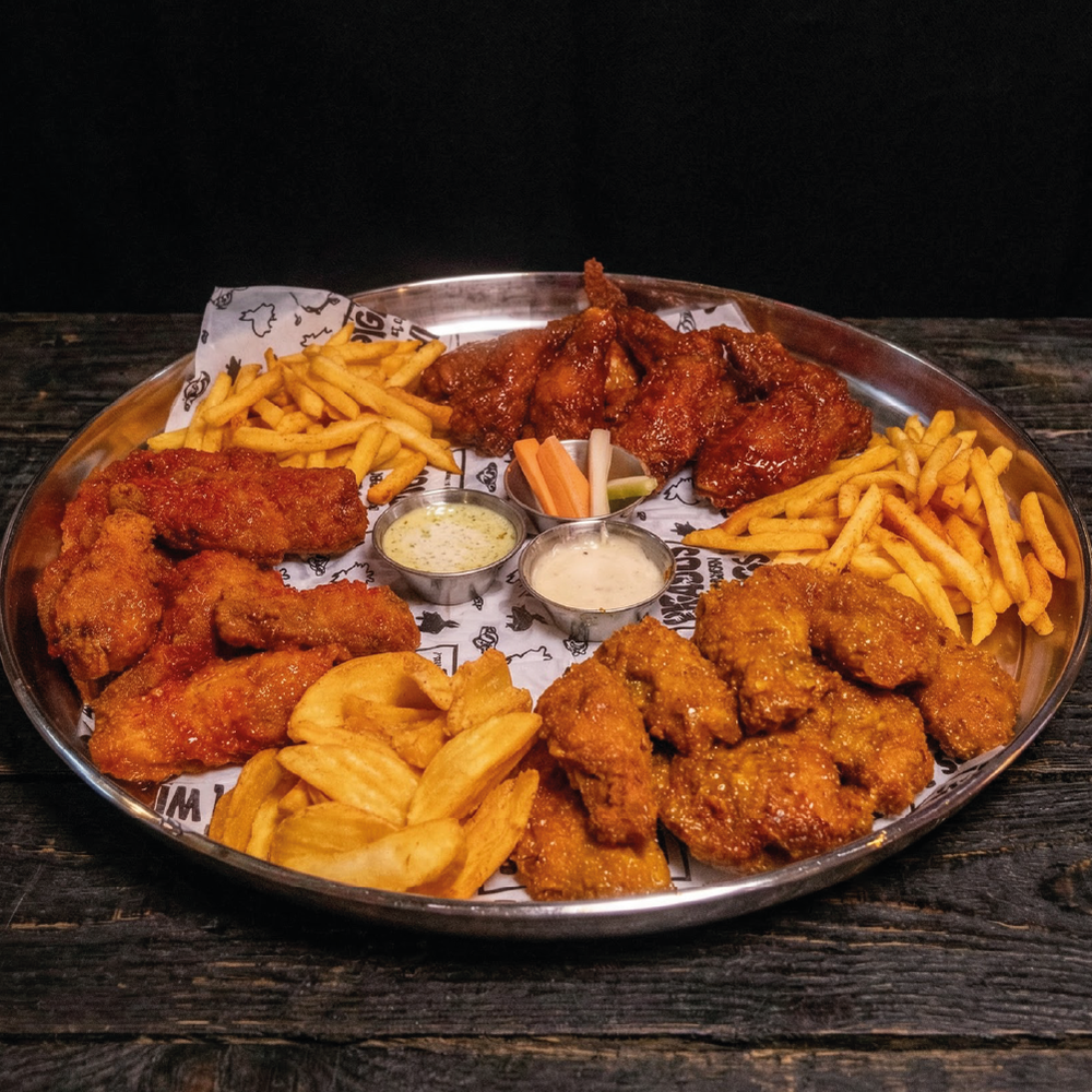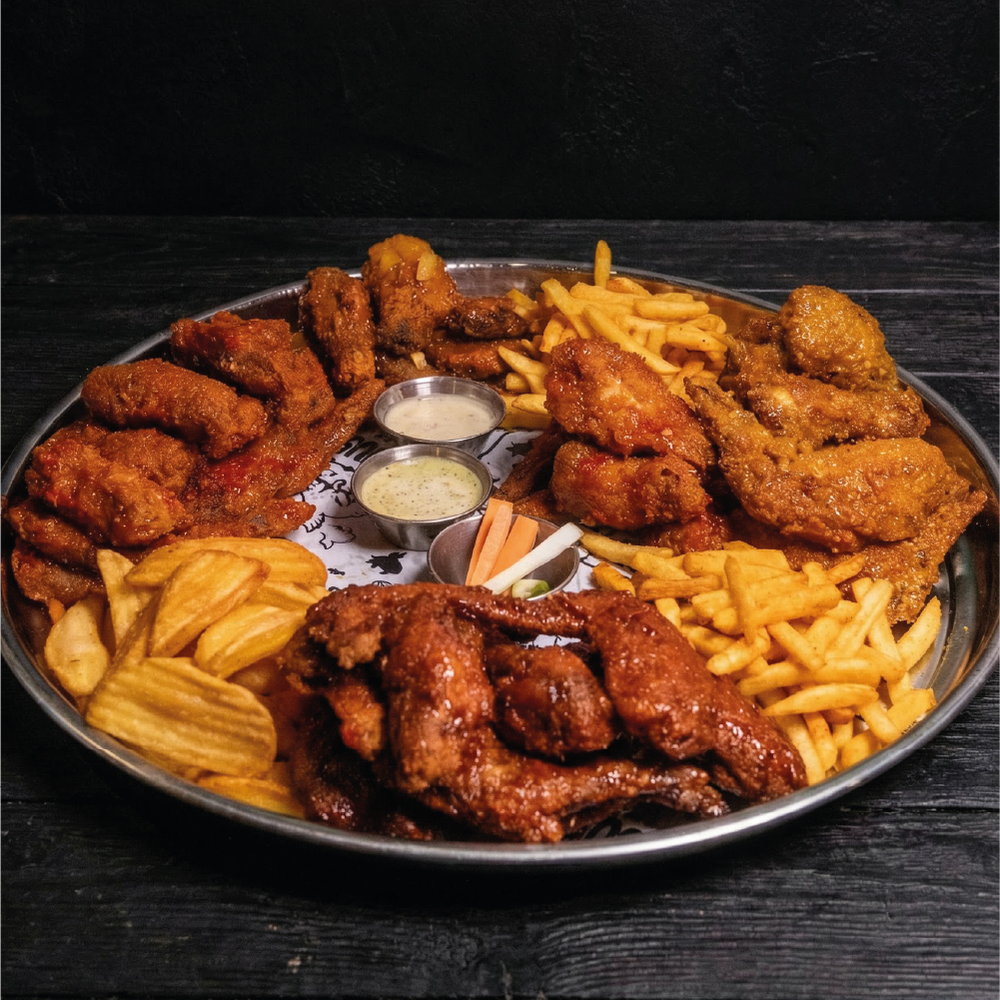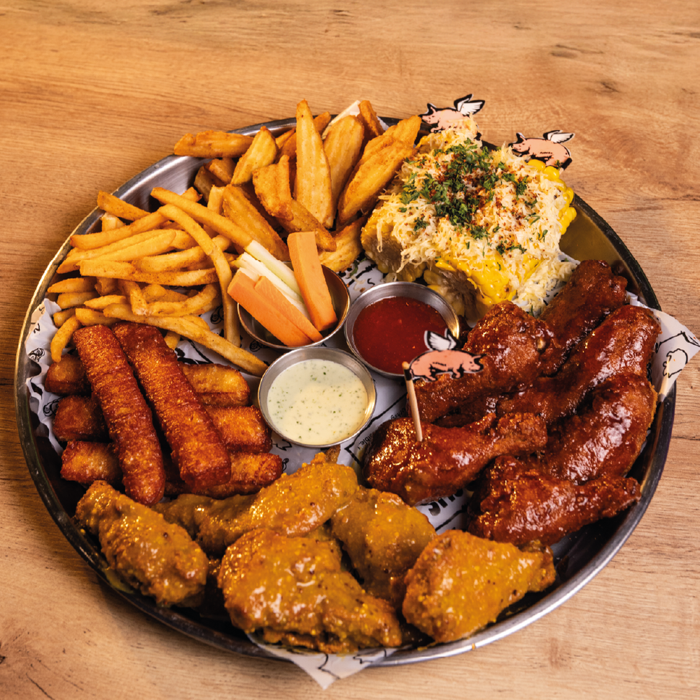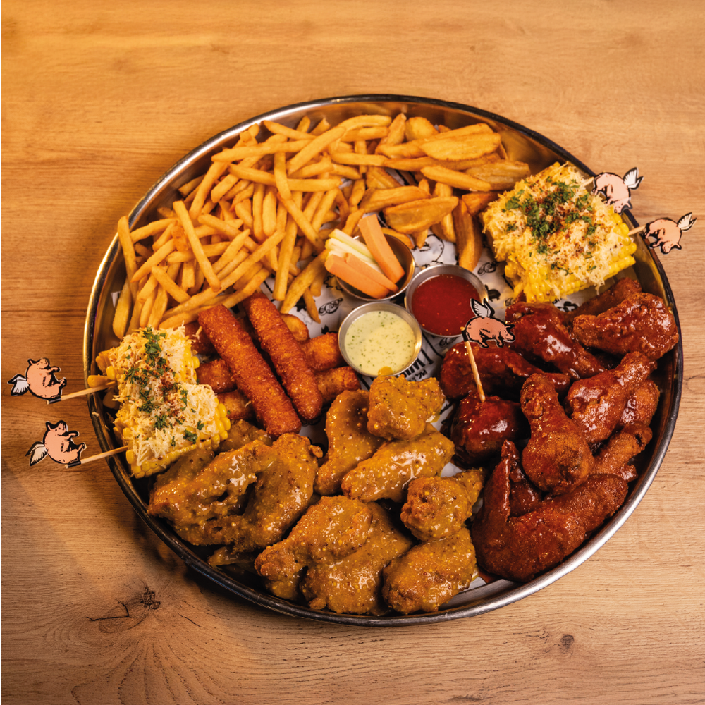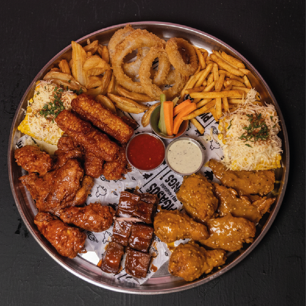 12 chicharrón wings + 12 chicken wings + 2 big alitas de cerdo + 4 raciones de papas + 4 mazorcas + queso papialpa + salsa de queso azul + zanahoria y apio.