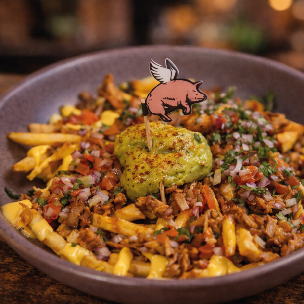 Crujientes papas a la francesa acompañadas de bondiola desmechada,pico de gallo,guacamole y bañadas con aderezo cheddar y salsa bbq.