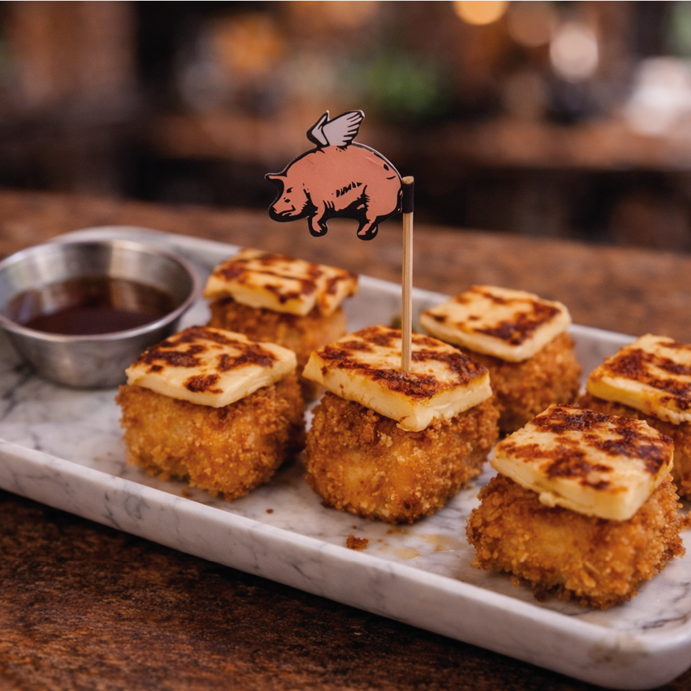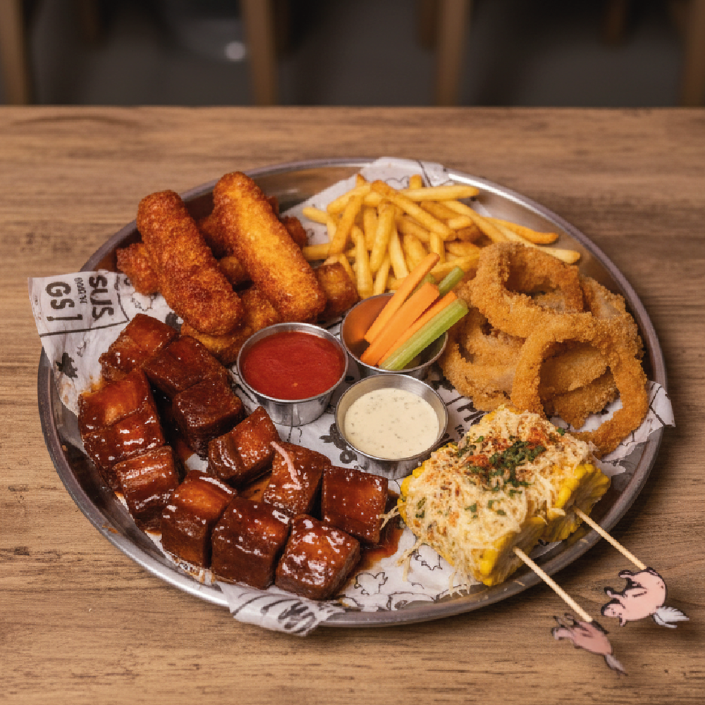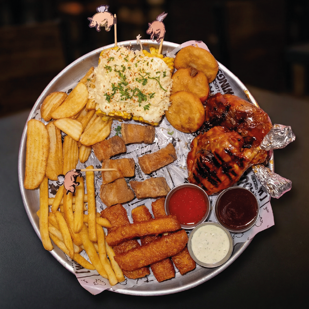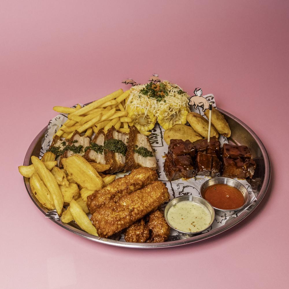 2 big alitas de cerdo, 6 chicharrón wings, 3 arepitas con chicharrón y queso, 2 mazorcas pigasus, 2 papas mixtas, 4 dedos de queso papialpa fritos