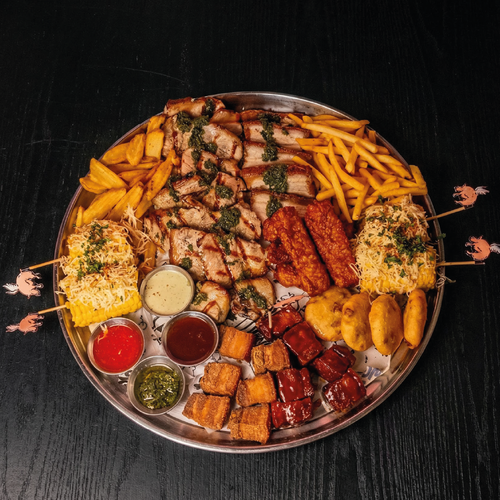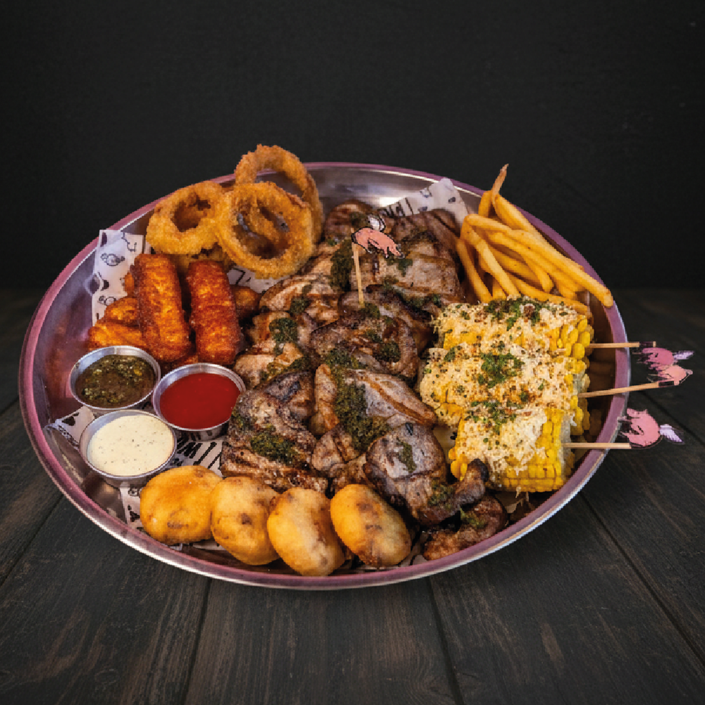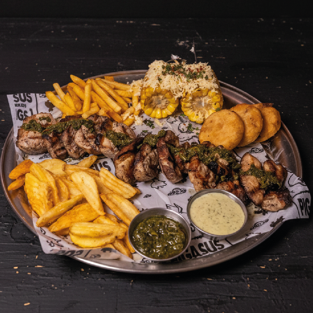 Costichi gigante de 700 gr. aproximadamente, punta de anca de cerdo en julianas a la parrilla con chimichurri, 6 chicken wings con salsa a elección, pollo parrillado en julianas, queso costeño asado acompañado de chile dulce, 5 arepitas fritas rellenas de chicharrón y queso, crujientes aros de cebolla 2 porciones de papas a la francesa y chicharrón de mazorca dulce. acompañado de nuestras salsas: alioli de ajo, bbq, crema agria y queso costeño rallado