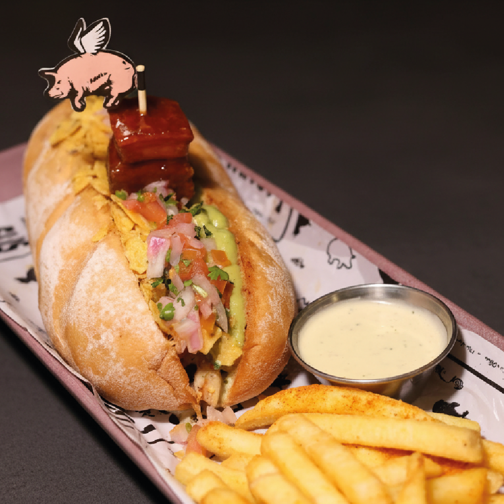 Sub de 20cm, servido en pan artellano, punta de anca de cerdo salteada en mantequilla de romero, con pico de gallo, guacamole, alioli de ajo y trozos de crujientes nachos. coronado con un chicharrón crocante bañado en salsa de la casa