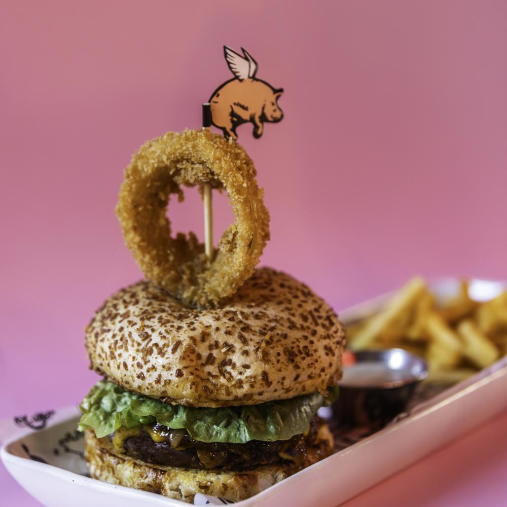 Pan artesanal con queso parmesano + carne de 166 gr de res y cerdo + queso cheddar + doble tocineta + cogollo europeo + 3 aros de cebolla crocante bañados en reducción balsámica y queso parmessano grana padano + Papas.