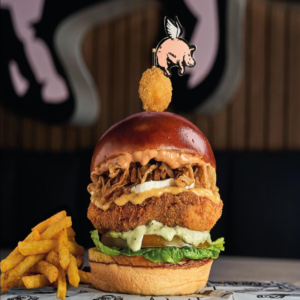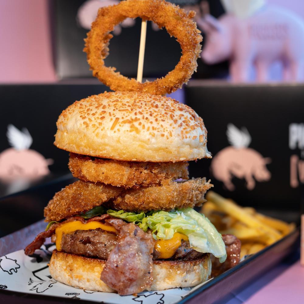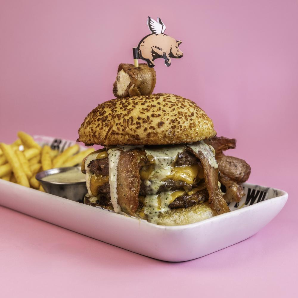 Hamburguesa pan artesanal de parmesano, doble carne de 166g c/u, 4 quesos cheddar, chicharrones bañados en salsa bbq, queso philadelphia, de tope chicharrón wings + Papas.