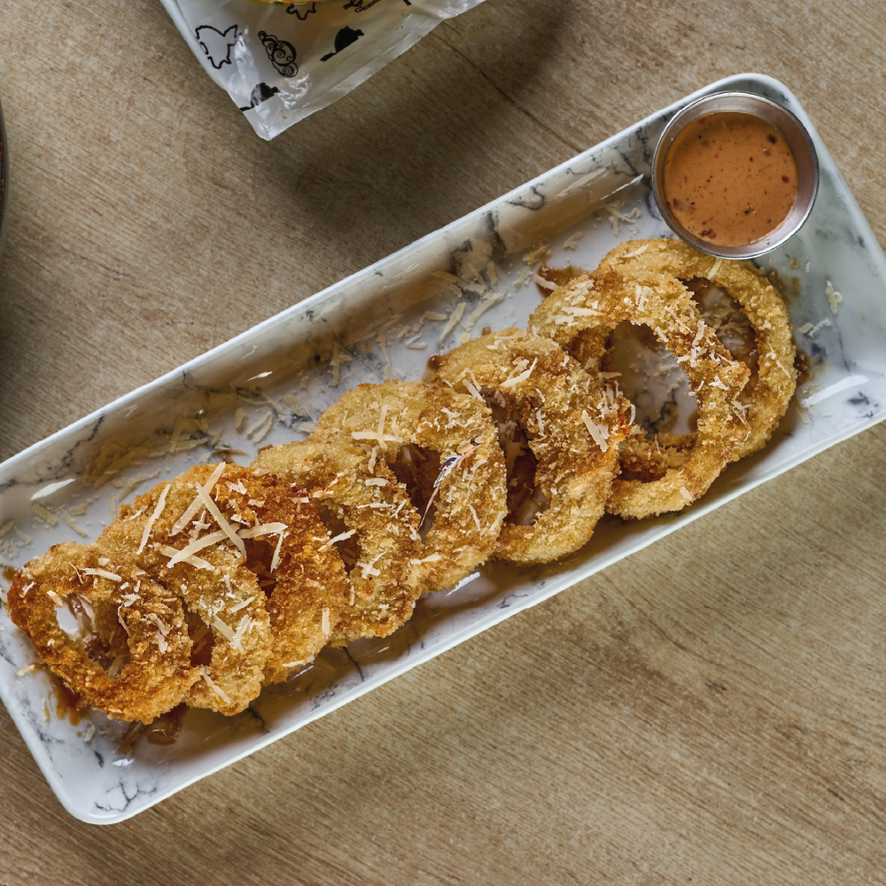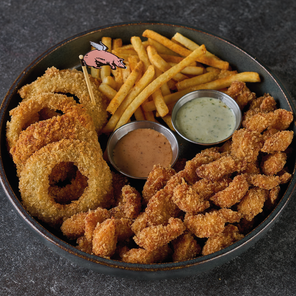 Deliciosa pechuga en forma de crispetas, nuestros crujientes aros de cebolla, papas a la francesa. Acompañado de alioli de ajo y salsa chipotle