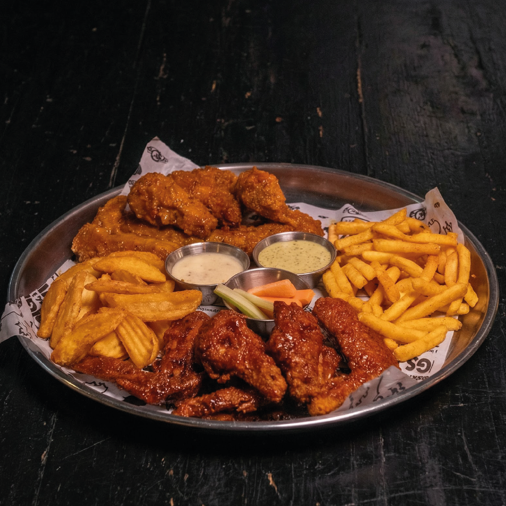 24 chicken wings, 2 porciones de papa, zanahoria y apio, salsa de queso azul, alioli de ajo y salsa a elección