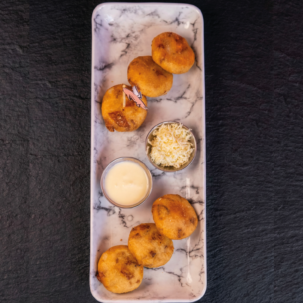 6 Arepitas de chicharrón acompañadas con sour cream y queso blanco.