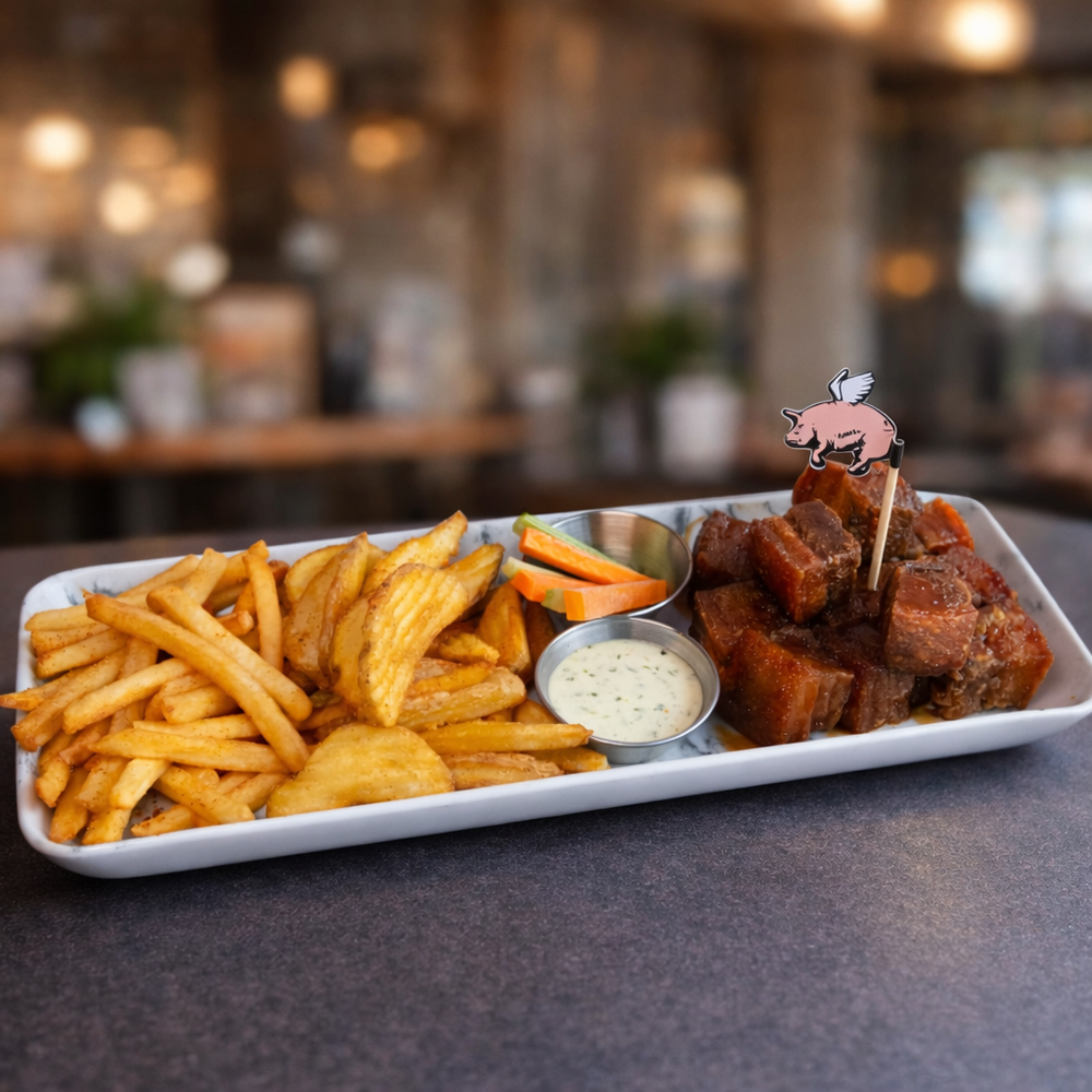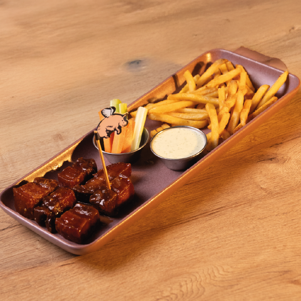 6 chicharrón wings bañadas en BBQ de la casa + 1 porción de papas + zanahoria y apio + salsa de queso azul y alioli de ajo.