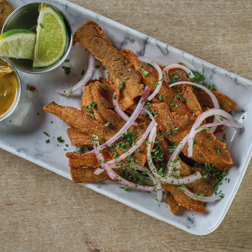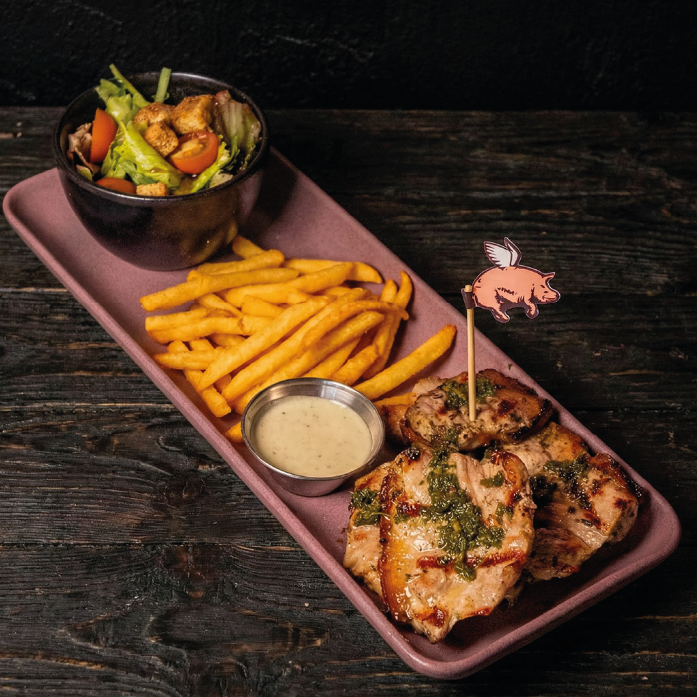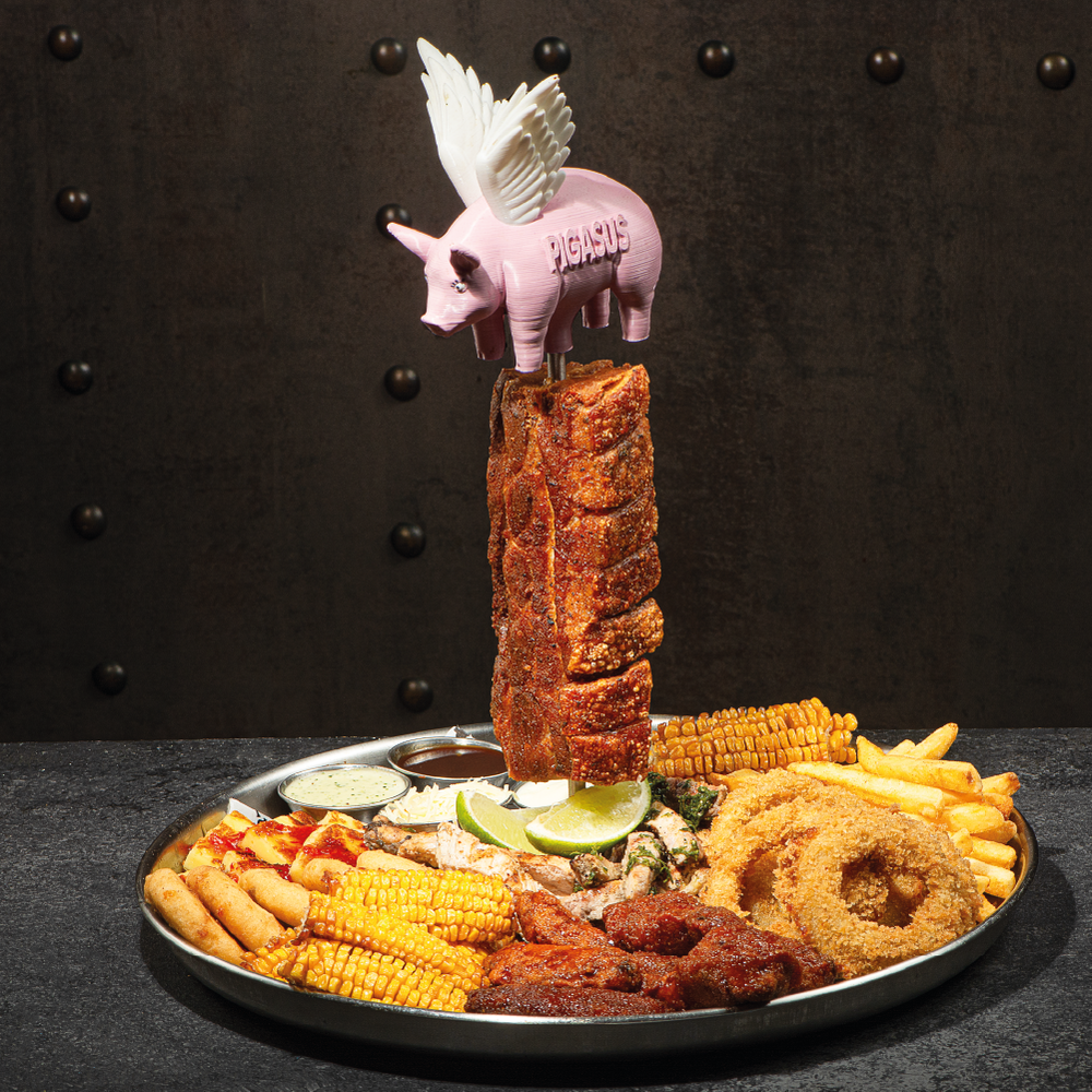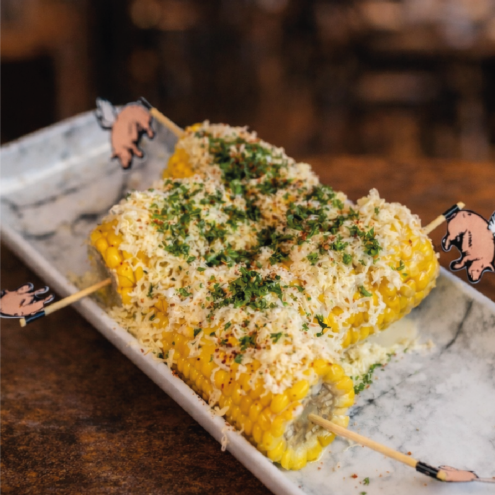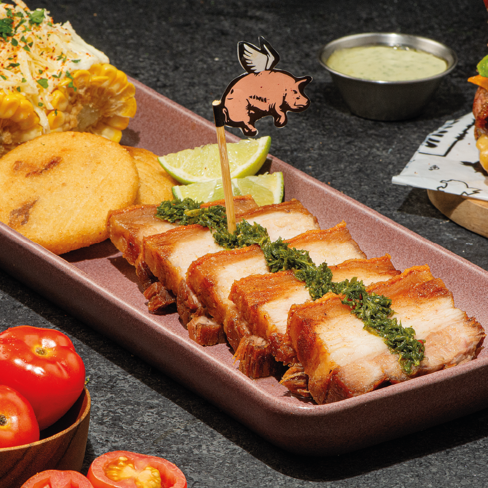 El más aclamado chicharrón del chef su corte jugoso y crocante, viene acompañado de dos arepitas con chicharrón y dos mazorcas al estilo Pigasus