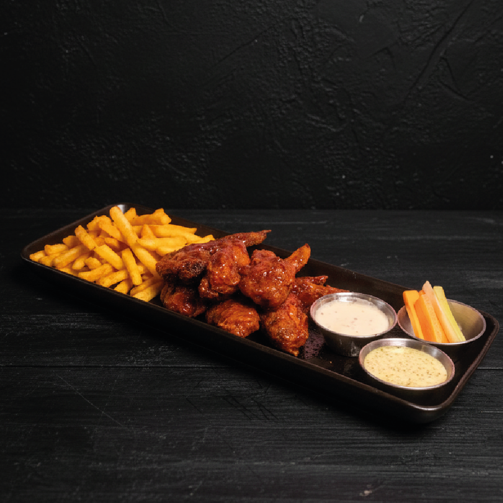 12 chicharrón wings bañadas en BBQ de la casa + 2 raciones de papas + zanahoria y apio + salsa de queso azul.