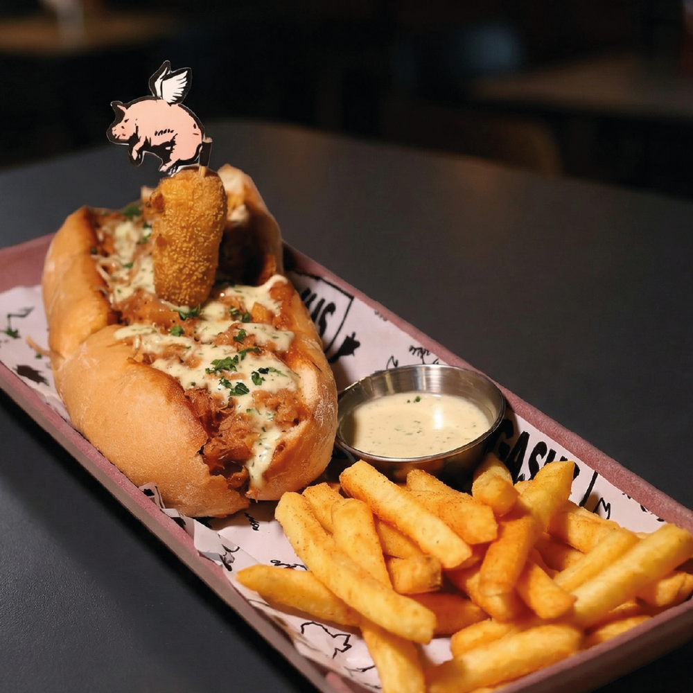 Sub de 20 cms con parmesano, cerdo desmechado, cebolla caramelizada, doble queso americano, alioli de ajo, salsa de queso azul, de tope un jalapeño relleno de queso cheddar