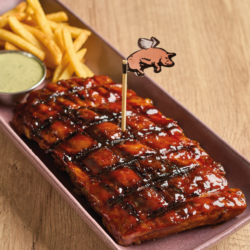 Más de 400g. de costillas de cerdo bañadas en salsa BBQ de la casa + 1 ración de papas + salsa de queso azul.