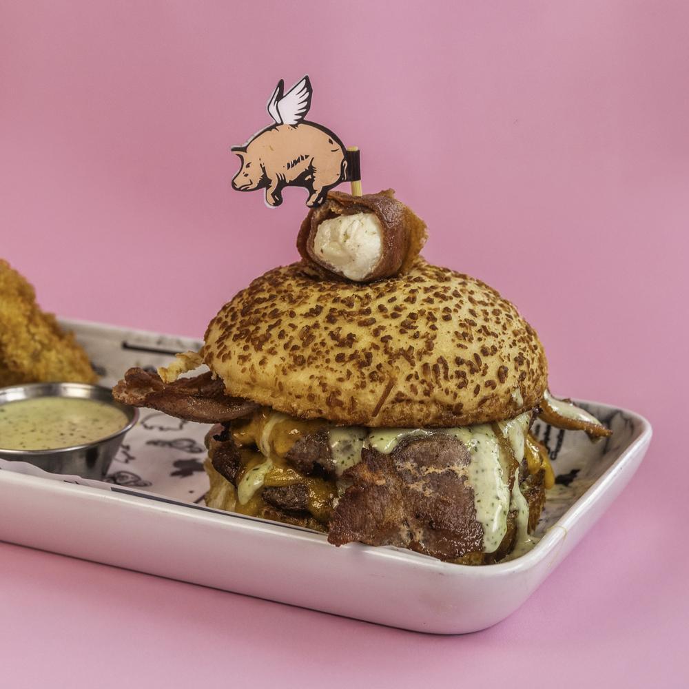 Pan artesanal con queso parmesano, doble carne de res, cerdo, doble queso cheddar, doble tocineta, alioli de ajo, corona de queso philadelphia envuelto en tocineta + Papas.