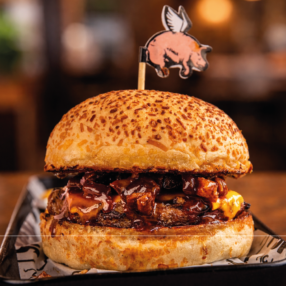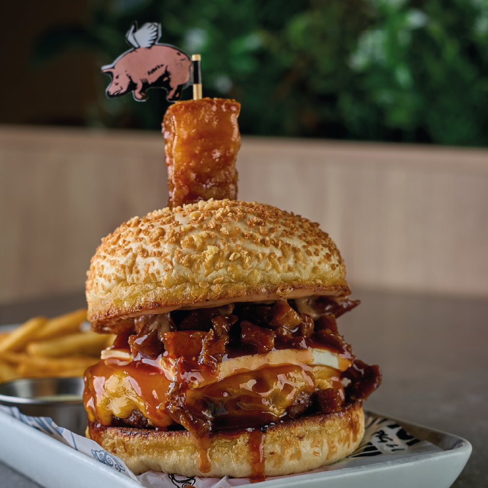 Hamburguesa de carne jugosa de res y cerdo, pan brioche con queso parmesano, queso cheddar y el toque especial de nuestros crujientes chicharrones bañados en salsa bbq de la casa.