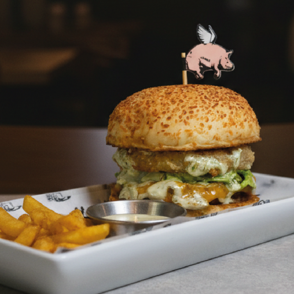 Proteína vegetal a base de plantas a la parrilla, pan artesanal de parmesano, queso cheddar, queso philadelphia, cogollo europeo, cebolla grilled + Papas.