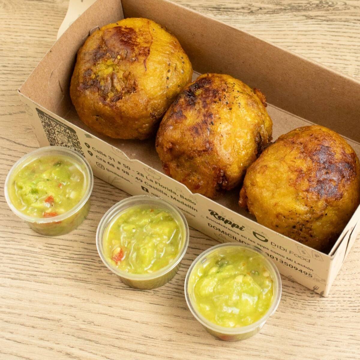 3 marranitas de lechona acompañadas de guacamole
