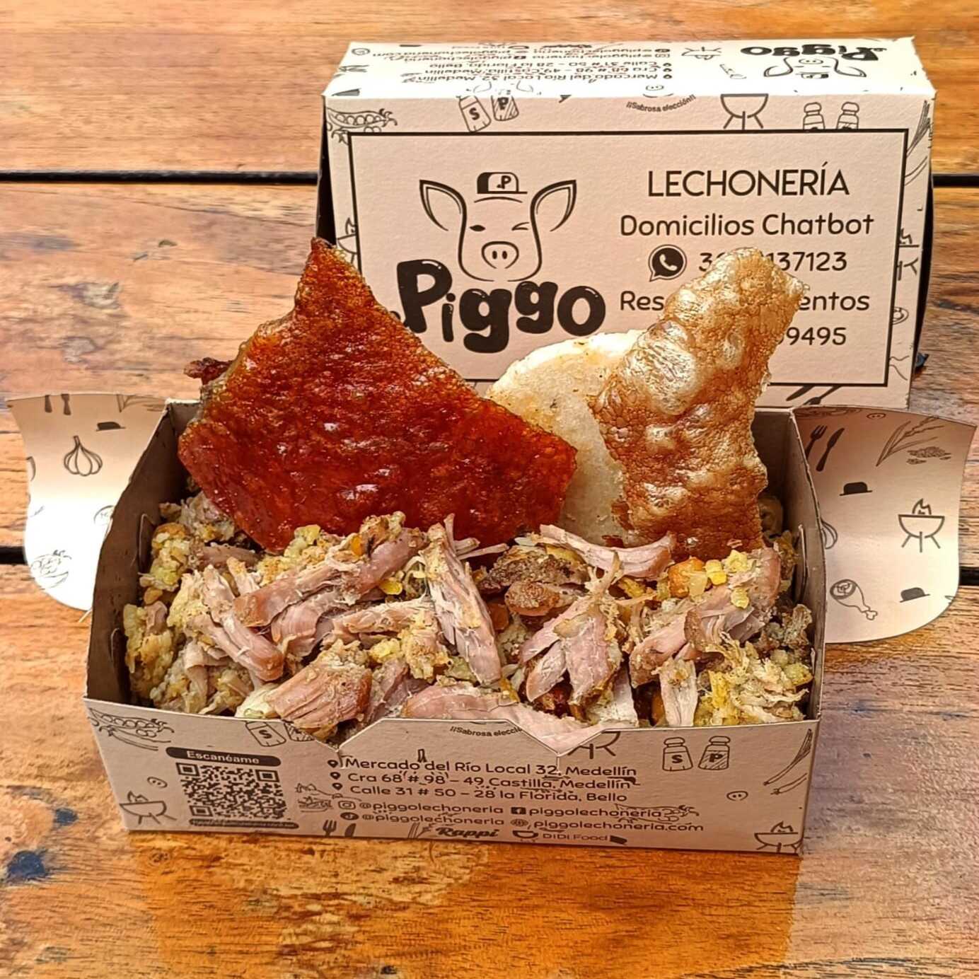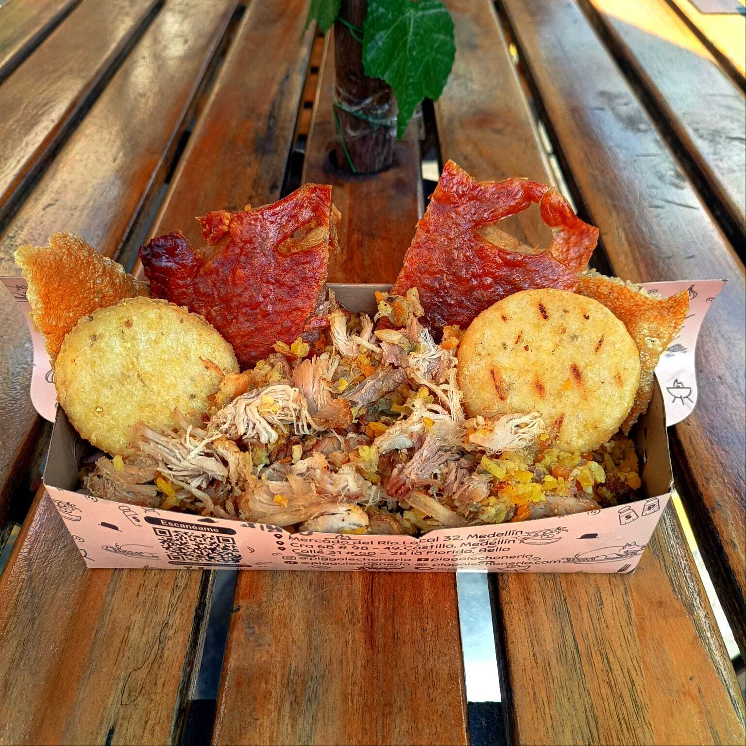 Aprox. 300 gr de Lechona con Cuerito Crocante (1 Pieza) y Una Arepa (1 Pieza).