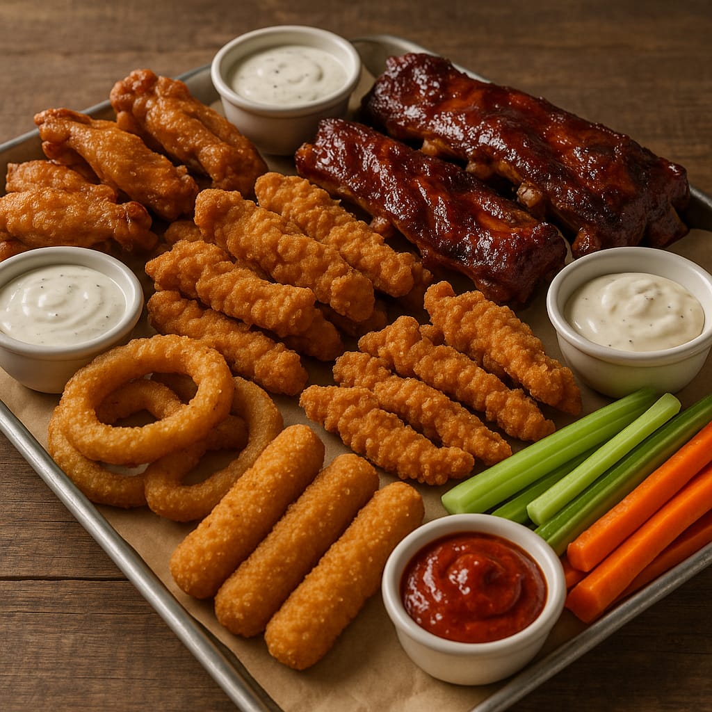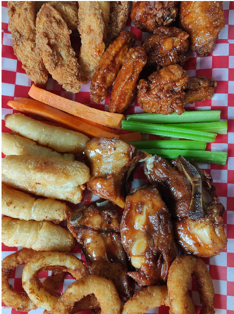 24 Alitas, 18 pechuguines, 6 costillas, 12 deditos de mozzarella, 12 aros de cebolla, bastones de apio y zanahoria, papas a la francesa, 3 gaseosas y salsas de la casa.