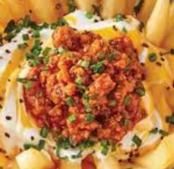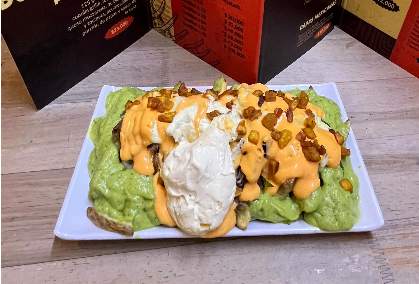 Papas, pico de gallo, carne desmechada, guacamole, sour cream, maduritos,queso mozarrella y salsa de queso cheddar.