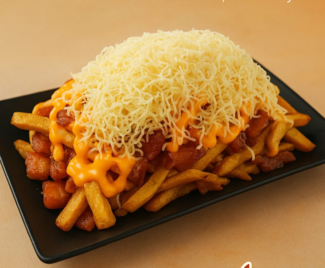 Papas, pico de gallo, carne artesanal,cebolla grillé, lechuga, tomate, queso mozarella, queso cheddar, tocineta y salsas de la casa.
