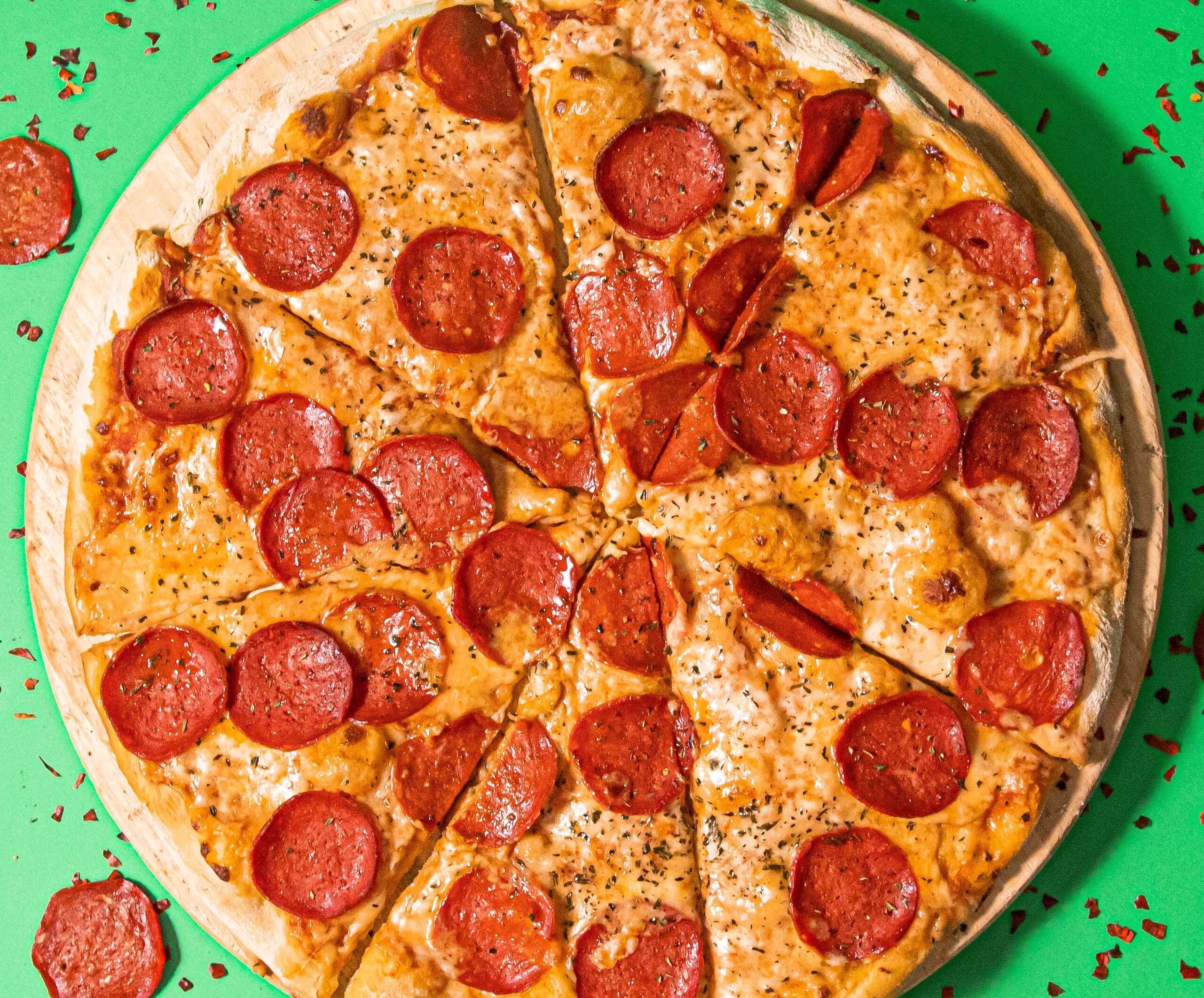 Pizza de 4 porciones con: Mozzarella, salsa napolitana, peperoni en rodajas y oregano