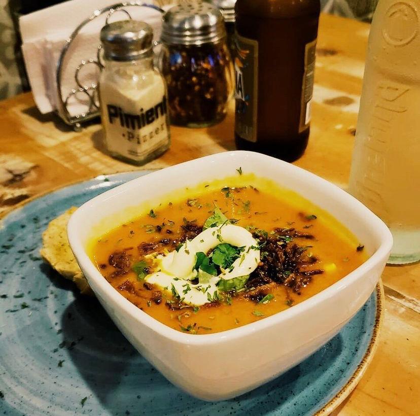 Crema de tomate natural, albahaca fresca, chip de cebolla, crema de leche y pan.