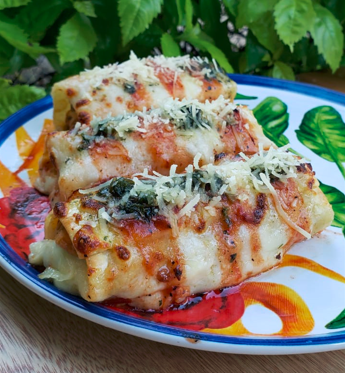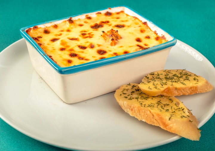 Mozzarella, pollo, salsa bechamel, crema de leche, tocineta y perejil. Acompañados de ensalada de la casa y pan con mantequilla de ajo.