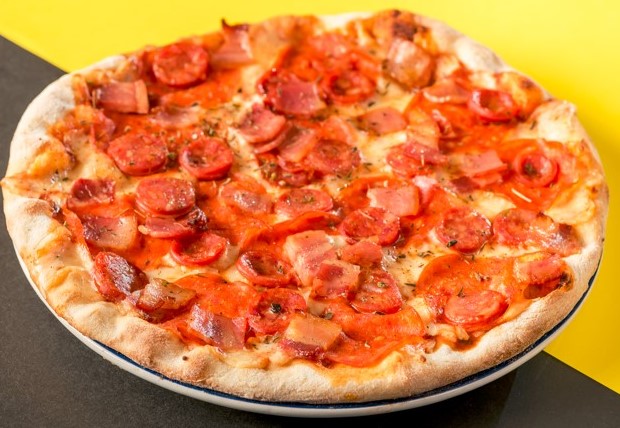 Mozzarella, base napolitana, pepperoni, chorizo campesino, tocineta y oregano.