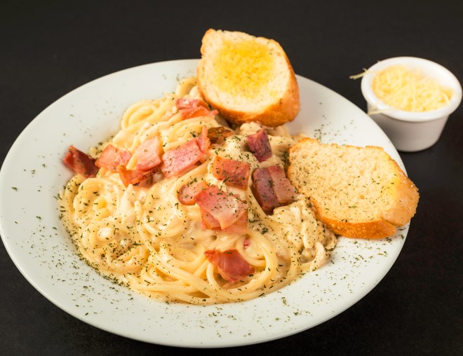 Porción de pasta, acompañada de pollo, tocineta, crema de leche, salsa bechamel y perejil. Acompañada de pan con mantequilla de ajo y queso parmesano.