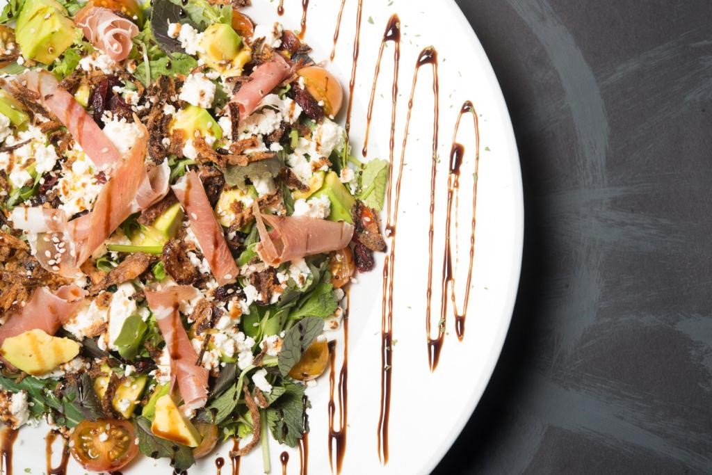 Mezclum de lechugas, jamon serrano, aguacate, tomate cherry, queso feta, chip de cebolla, arandanos, reduccion de balsamico, ajonjoli y perejil.