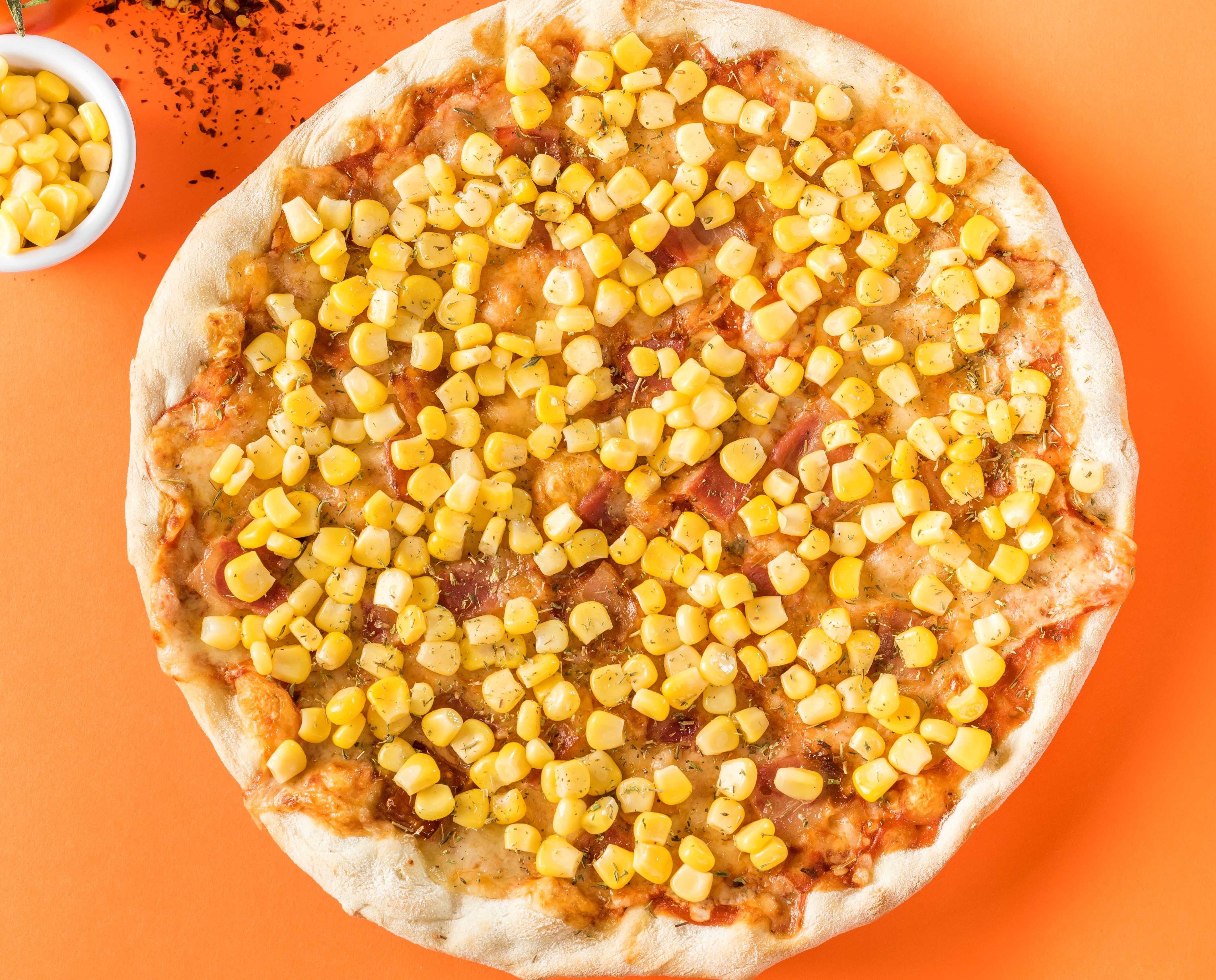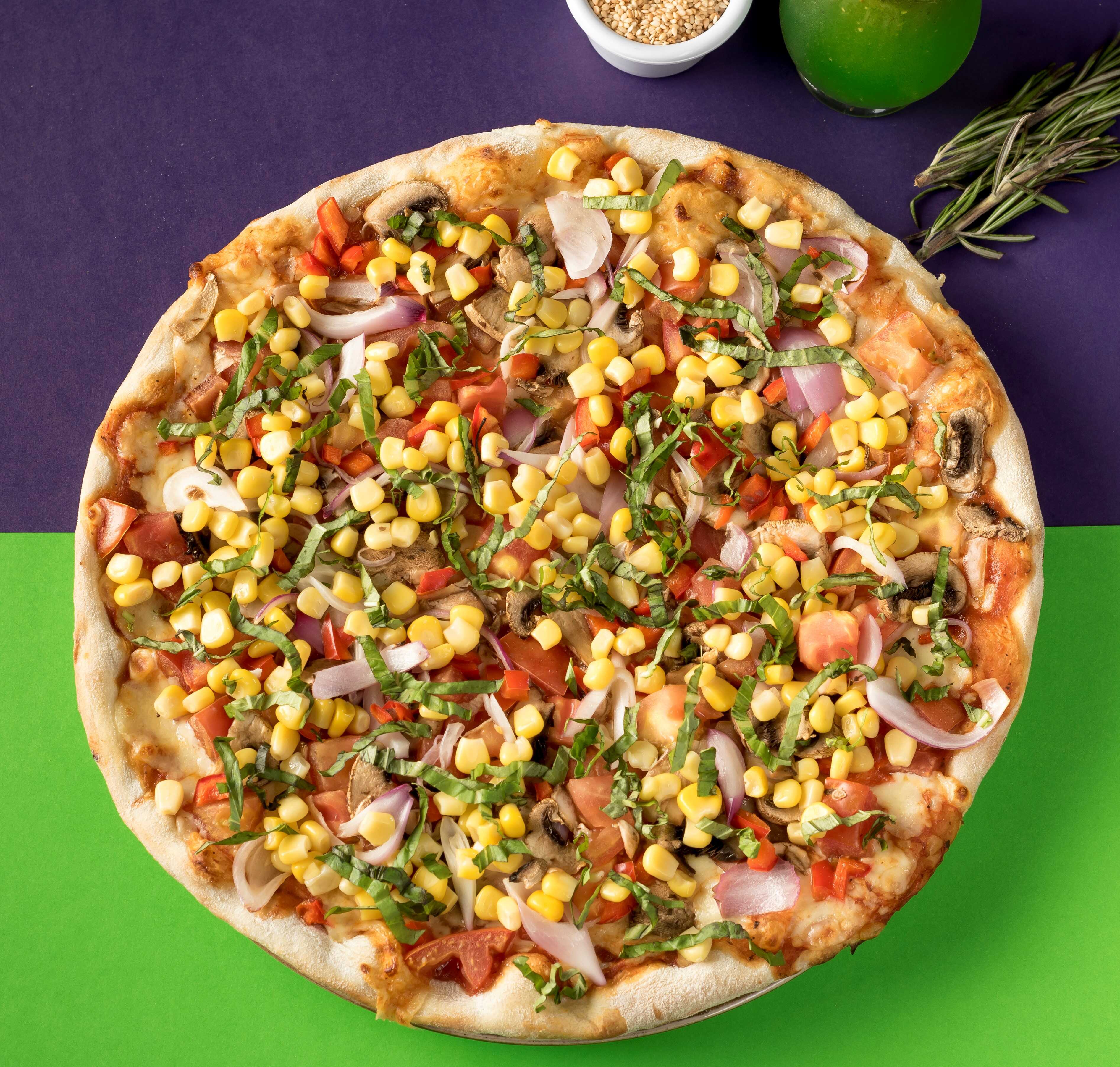 Mozzarella, tomate, maiz, champiñon, cebolla, pimenton, albahaca y oregano