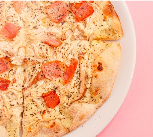 Mozzarella, pollo, tocineta, crema de leche, salsa bechamel y perejil.