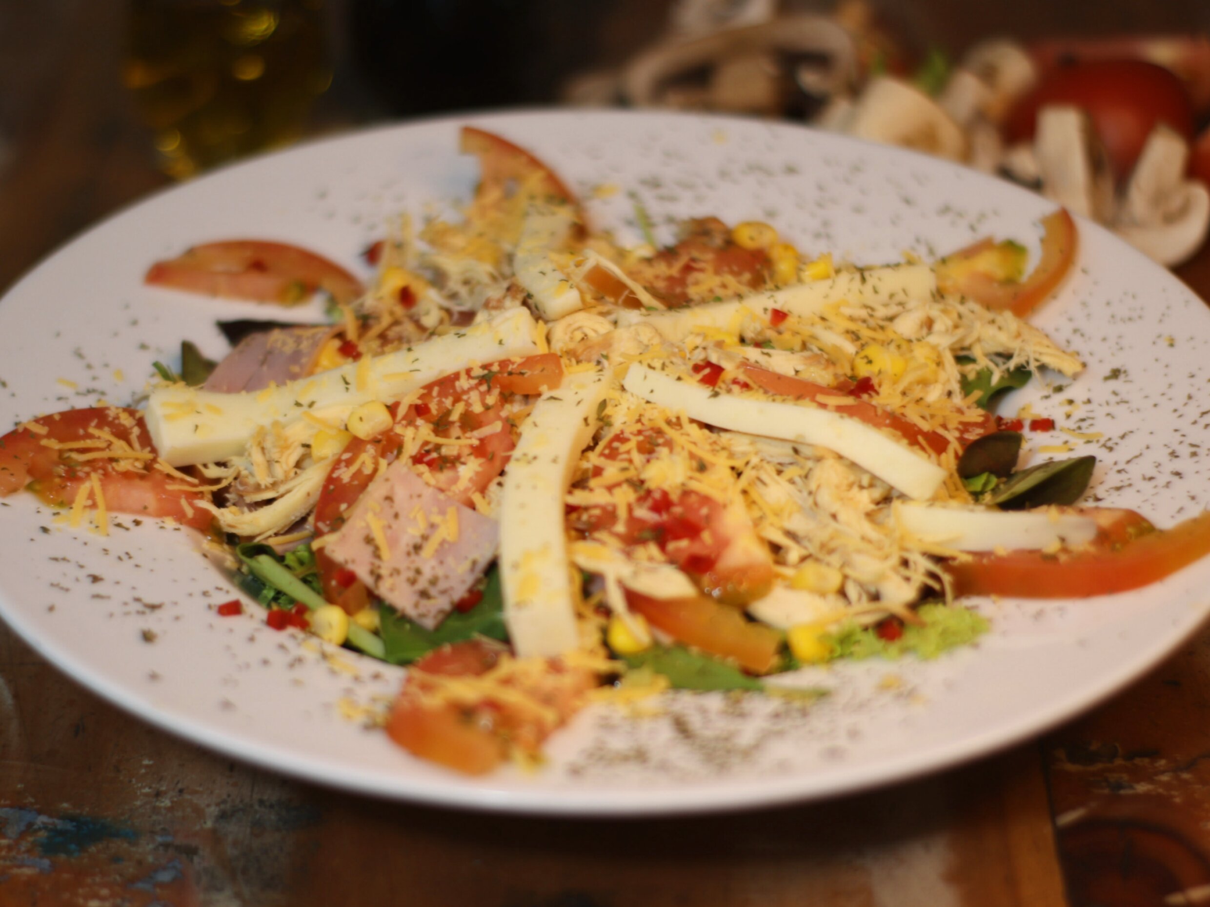 Mézclum de lechugas, pollo, jamón, tomate, pimentón, maíz tierno, mozzarella, queso parmesano, salsa cesar y perejil.