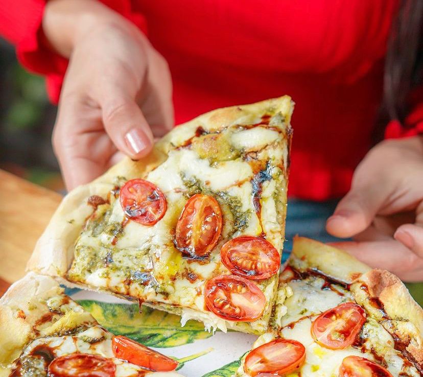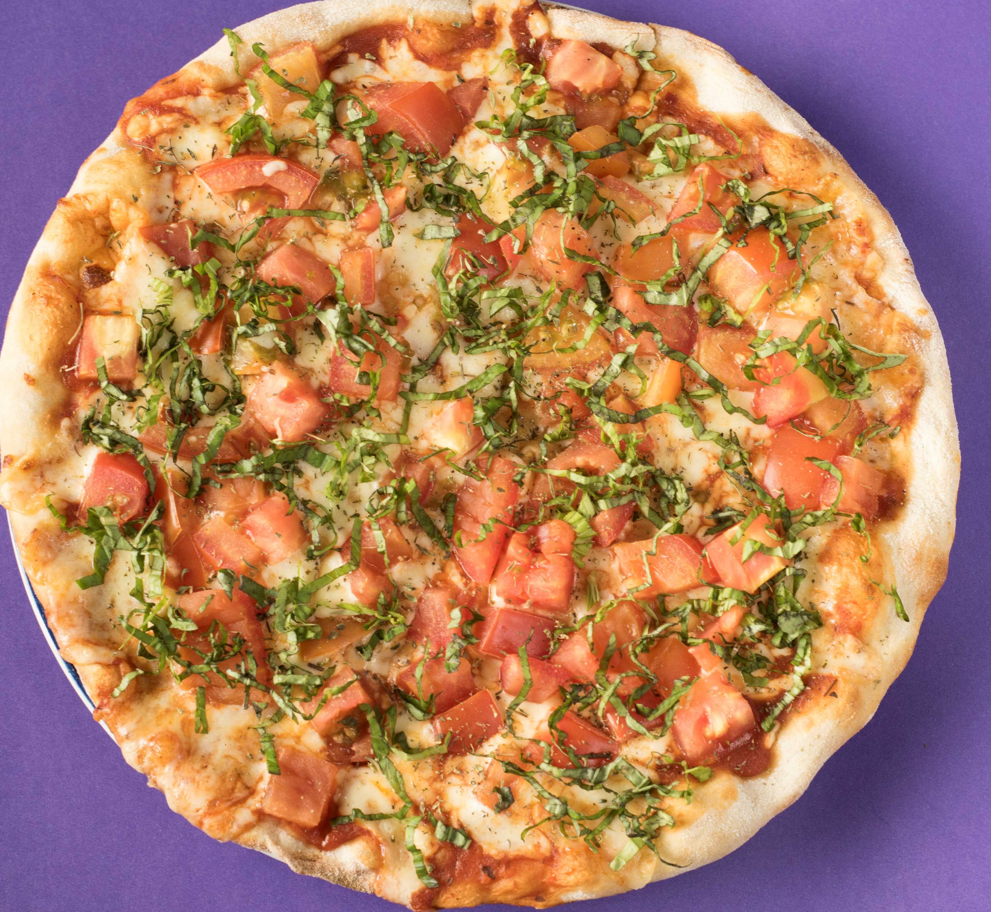 Mozzarella, salsa Napolitana, tomate en cuadros, albahaca y oregano