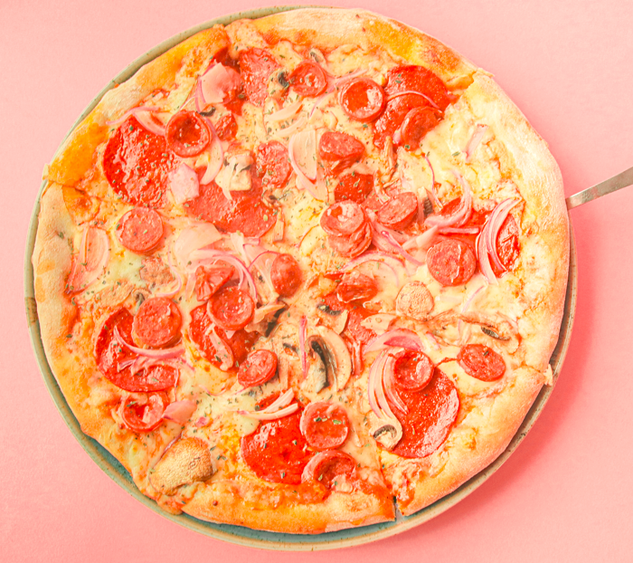Mozzarella, base napolitana, pepperoni, champiñones, chorizo dulce, cebolla y orégano.