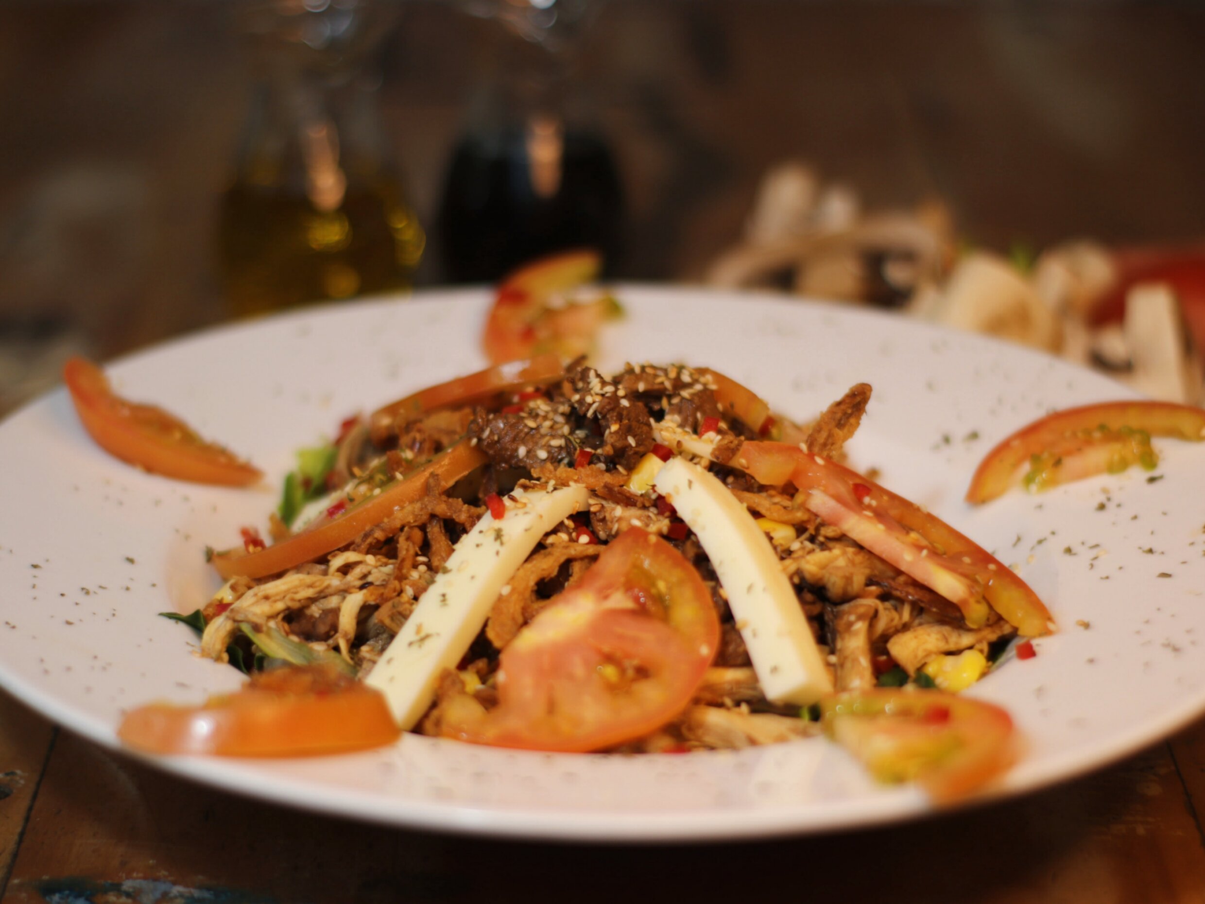 Mézclum de lechugas, pollo, lomo de res, maíz tierno, tomate, pimentón, mozzarella, ajonjolí, salsa teriyaki y chip de cebolla.