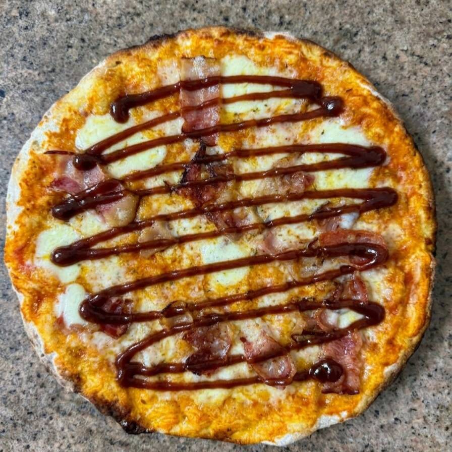 ¡El Sabor que Sorprende! Pizza mediana de 6 porciones con base de mozzarella y napolitana, cubierta con crujiente tocineta ahumada y piña caramelizada con un toque picante.