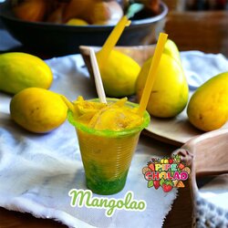 Raspado de mango biche, con trocitos y tiras de mango combinado con nuestra crema de la casa con lecherita.