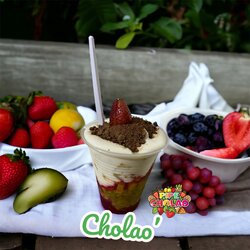 Postre de Brownie combinado con nuestra exquisita crema con 2 capas fresas y durazno, adición de queso, mani y salsa de chocolate o arequipe acompañada con cuchara comestible