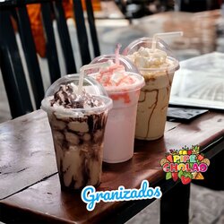 Raspadito con jarabe de sabor con todas las frutas, mango, piña, banano, maracuyá, guanábana, fresas, con deliciosa crema de la casa, bañado en lechera y Milo, también con cuchara comestible.