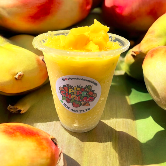 Raspado de mango biche, con trocitos y tiras de mango, bañados con nuestro especial jugo cítrico y limón, sal pimienta.