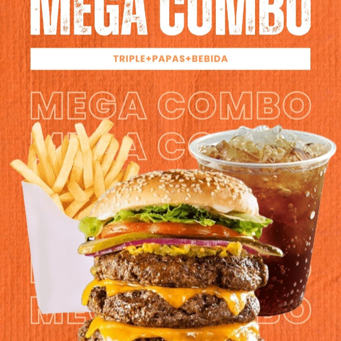 Jugosa hamburguesa con Triple carne 100% res, tocineta ahumada, queso mozzarella, salsa de queso cheddar, BBQ Jack Daniel's , sobre una cama de lechuga, tomates, cebolla, en un rico pan artesanal, acompañada de papas a la francesa, salsas de la casa y Mr Tea