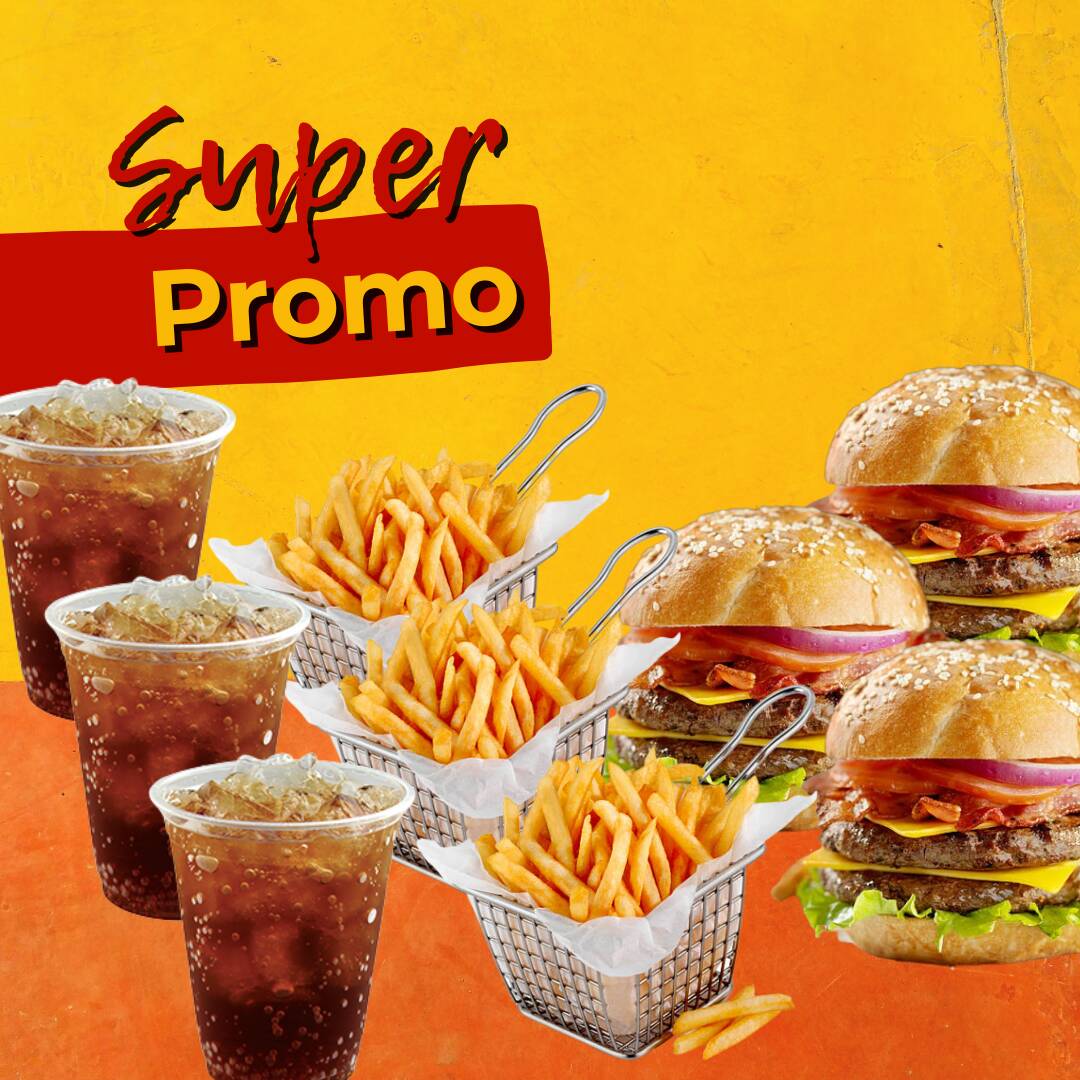 2 jugosas hamburguesas con doble carne 100% res, tocineta ahumada, queso mozarella, queso cheddar, queso parmesano, sobre una cama de Lechuga, tomates, cebolla caramelizada, en un rico pan artesanal. Acompañada de papas a la francesa, salsas de la casa y 3 coca colas.