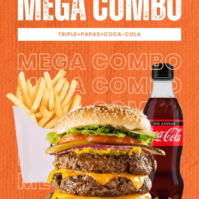 Jugosa hamburguesa 100% res, tocineta ahumada, queso mozzarella, queso cheddar, queso parmesano, sobre una cama de lechuga, tomate, cebolla caramelizada, en un rico pan artesanal, acompañada de papas a la francesa, salsas de la casa y coca cola.
