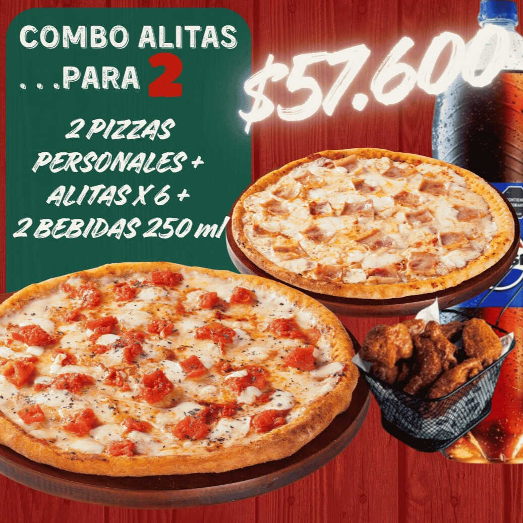 2 pizzas personales con sabores a eleccion, Alits x 6 unidades y 2 gaseosas de 250ml