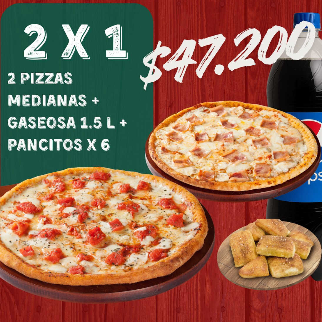 2 Pizzas Medianas + Gaseosa 1.5 + Pancitos x6