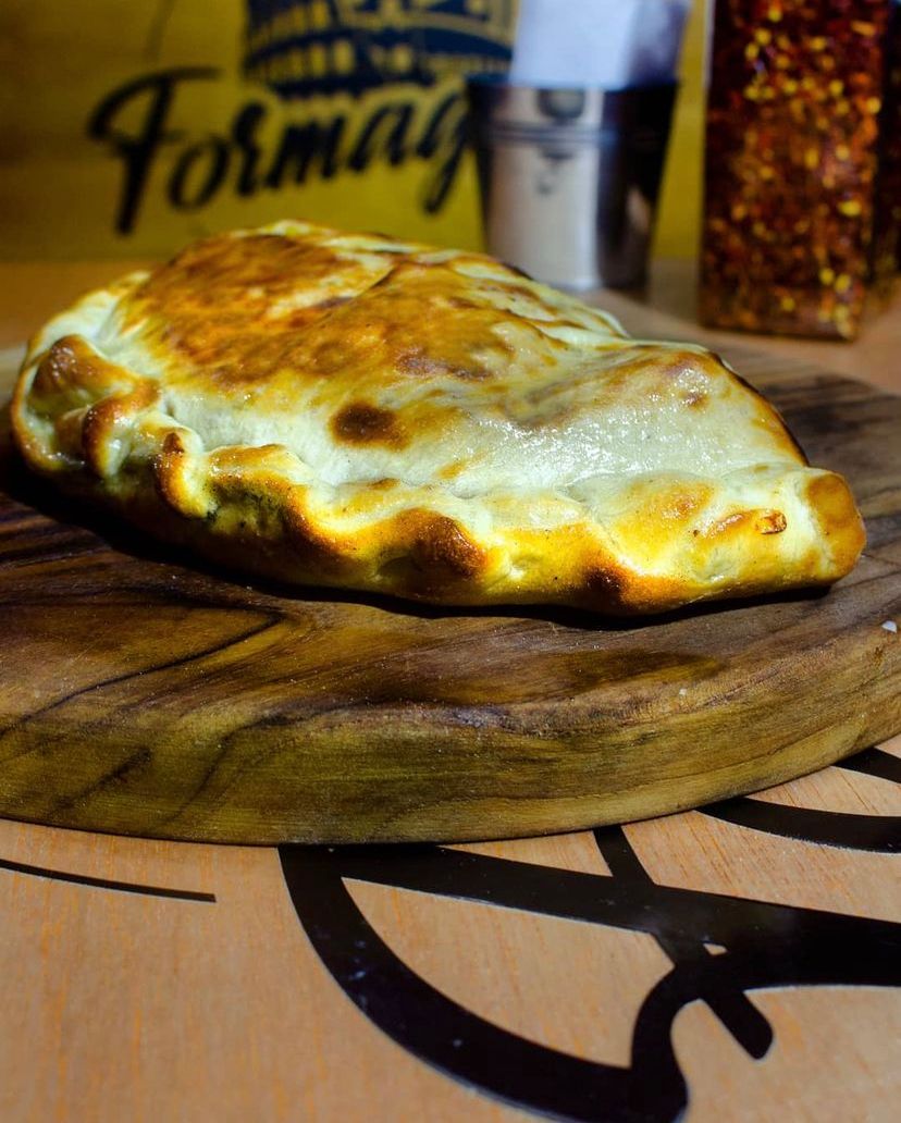 Pizza rellena gratinada en queso philadelphia y mozzarella.