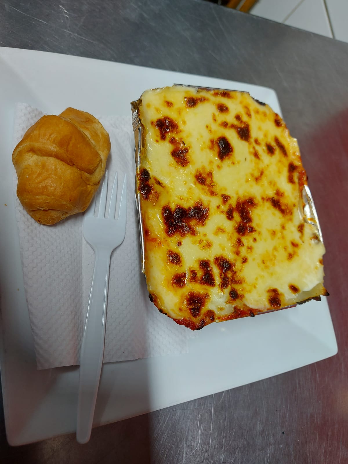 Para 1 persona, bechamel, bolognesa de carne, queso mozzarella, pasta y pan fresco.