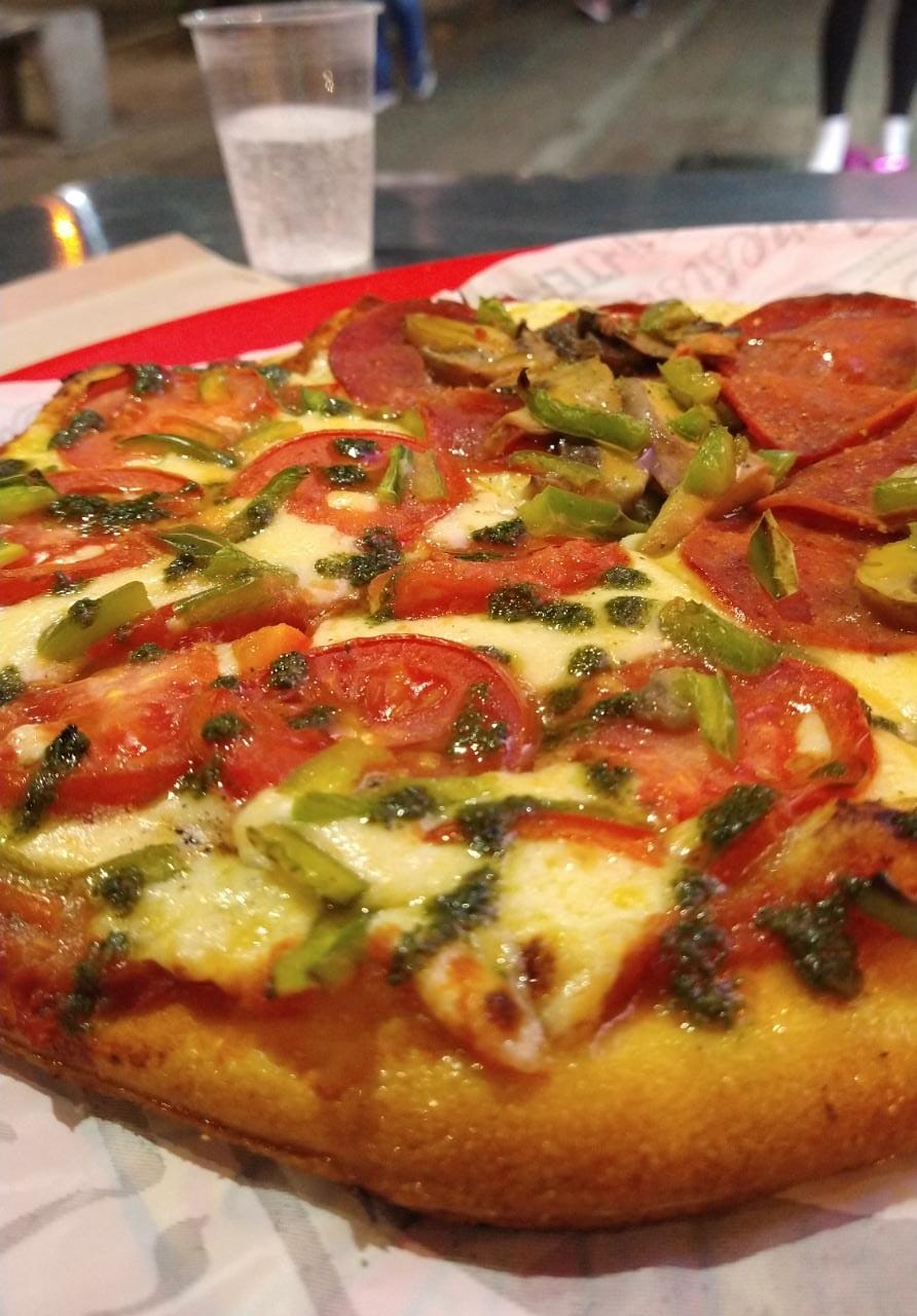 Ingredientes: tomate, pimentón, cebolla, champiñón, aceitunas, jalapeños, maíz y albahaca fresca.