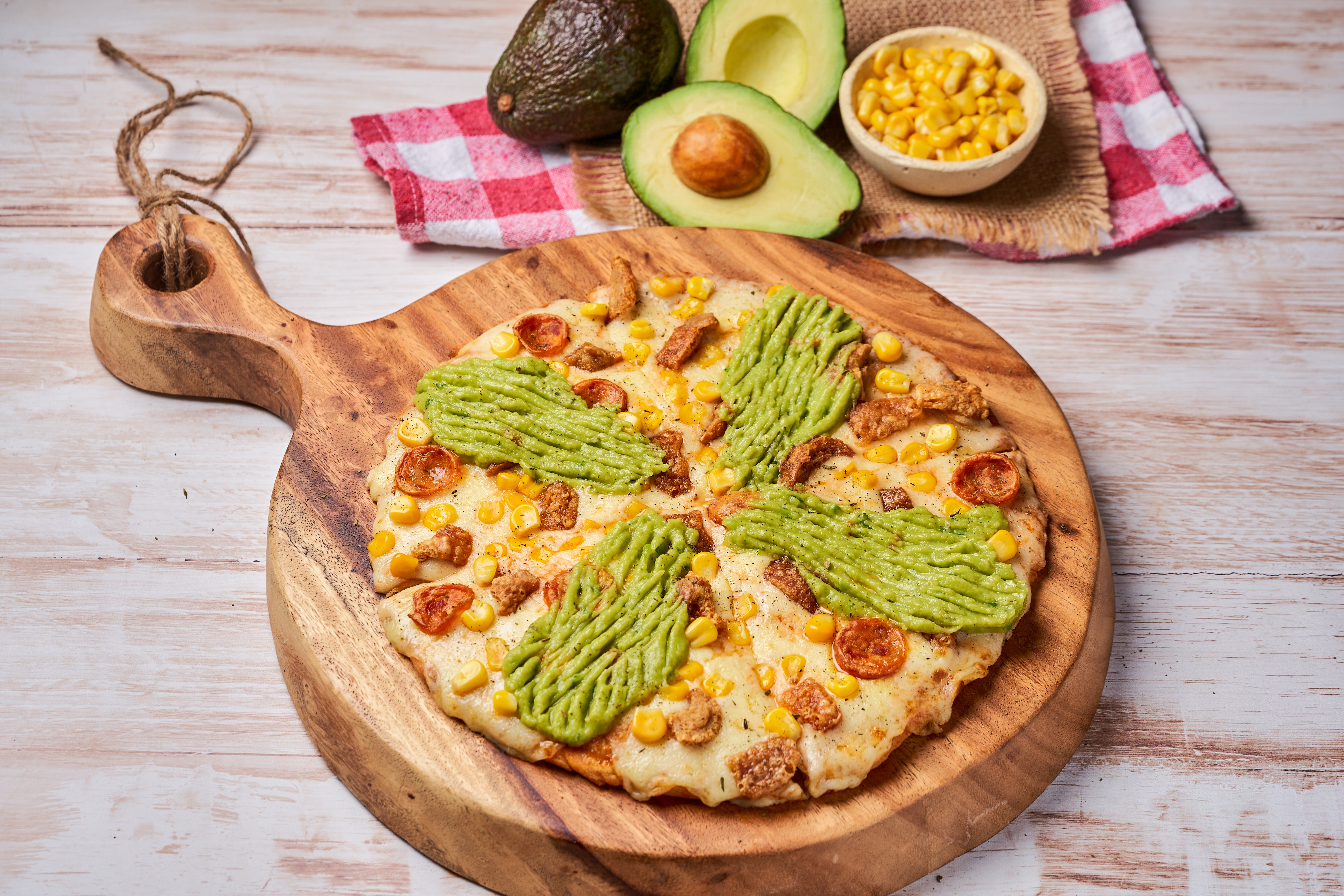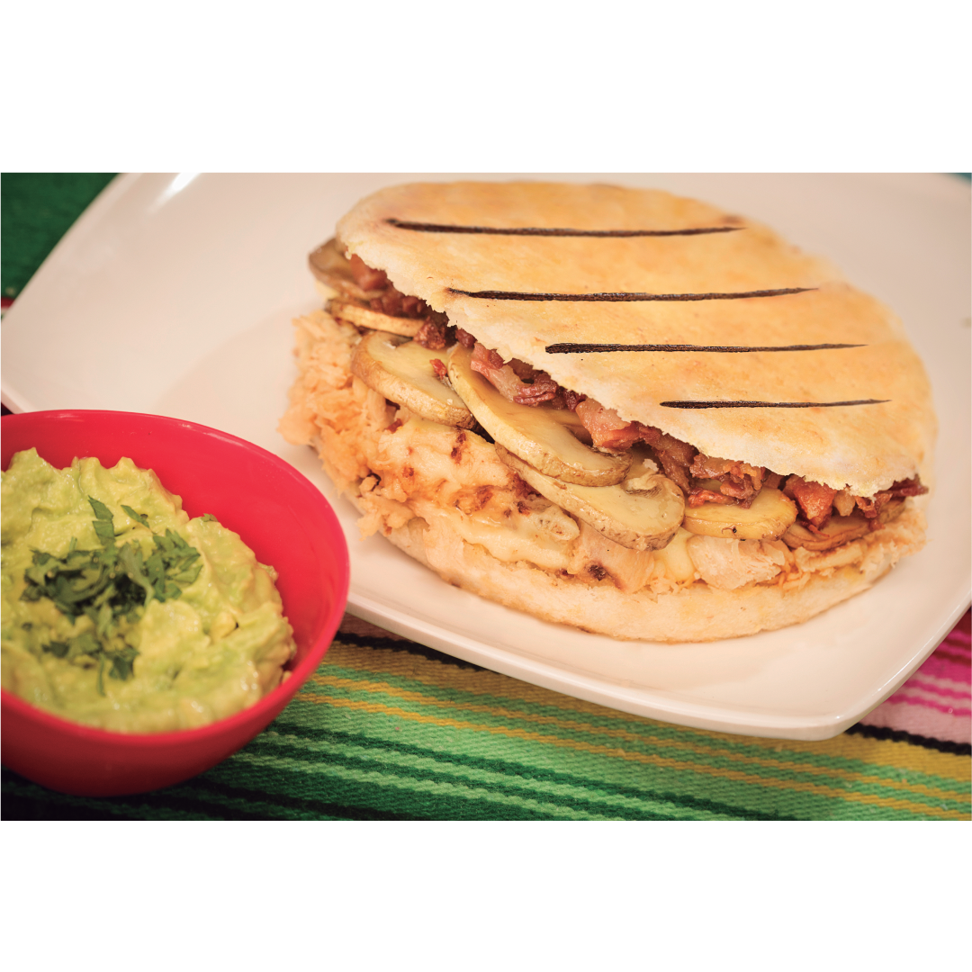 Patacón pollo, guacamole, tocineta y maíz.